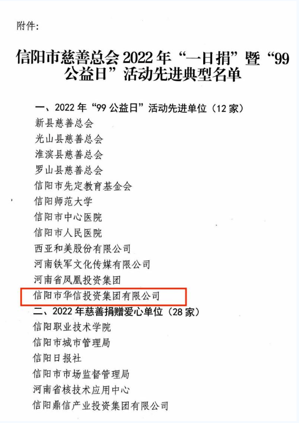 8月24日,在信陽市2023年“公益慈善月”暨“99公益日”活動動員會上,華信建投集團榮獲“2022年‘99公益日’活動先進單位”榮譽稱號。